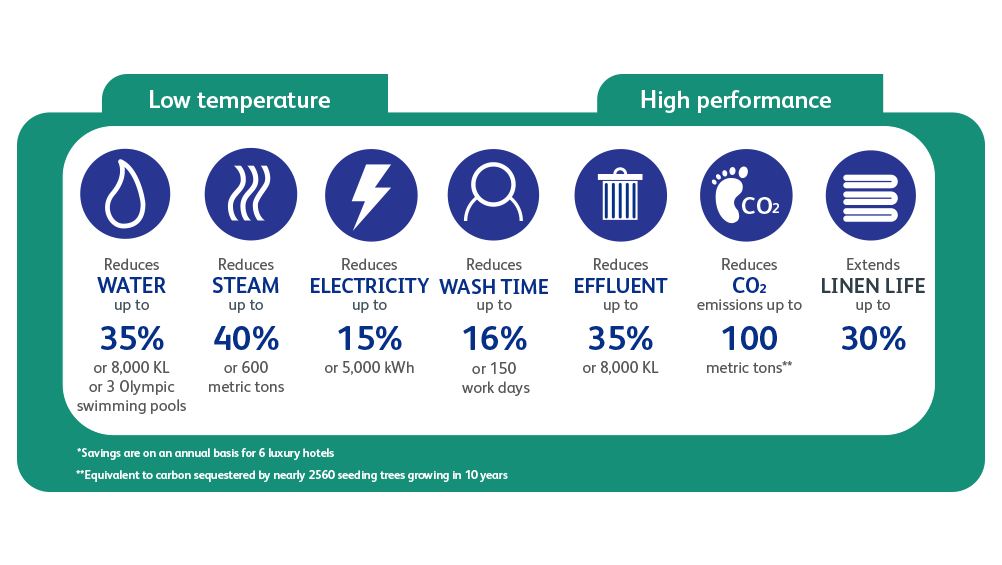 Diversey is committed to helping customers achieve a more sustainable business, by reducing greenhouse gases while cutting operating costs. The success of Clax Advanced has been validated in multiple countries around the world, including luxury hotels and nursing homes, with substantial operational savings* in conserving energy and water while reducing waste. The wash performance and utility savings have also been certified by Hohenstein laboratories - an independent well-established research institute for laundry.