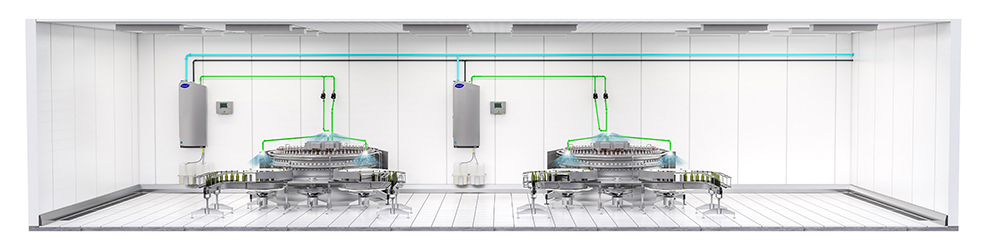 Manual centralized OPC is optimal for plants where concentrated chemicals are not allowed inside the process rooms. In a centralized configuration, all chemicals are pre-diluted in a separate, isolated chemical room and distributed through a series of pipelines. In the chemicals room, the rinsing water pressure is boosted by means of a multi-stage pump. Each satellite OPC unit will receive pre-diluted cleaning foam, pre-diluted sanitizer, and boosted pressure water.
