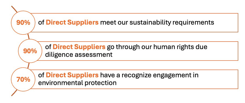 As such, we assess the sustainability performance of our suppliers on their environmental management, health and safety practices, business ethics, and human rights. Human Right due diligence includes but is not limited to,:
